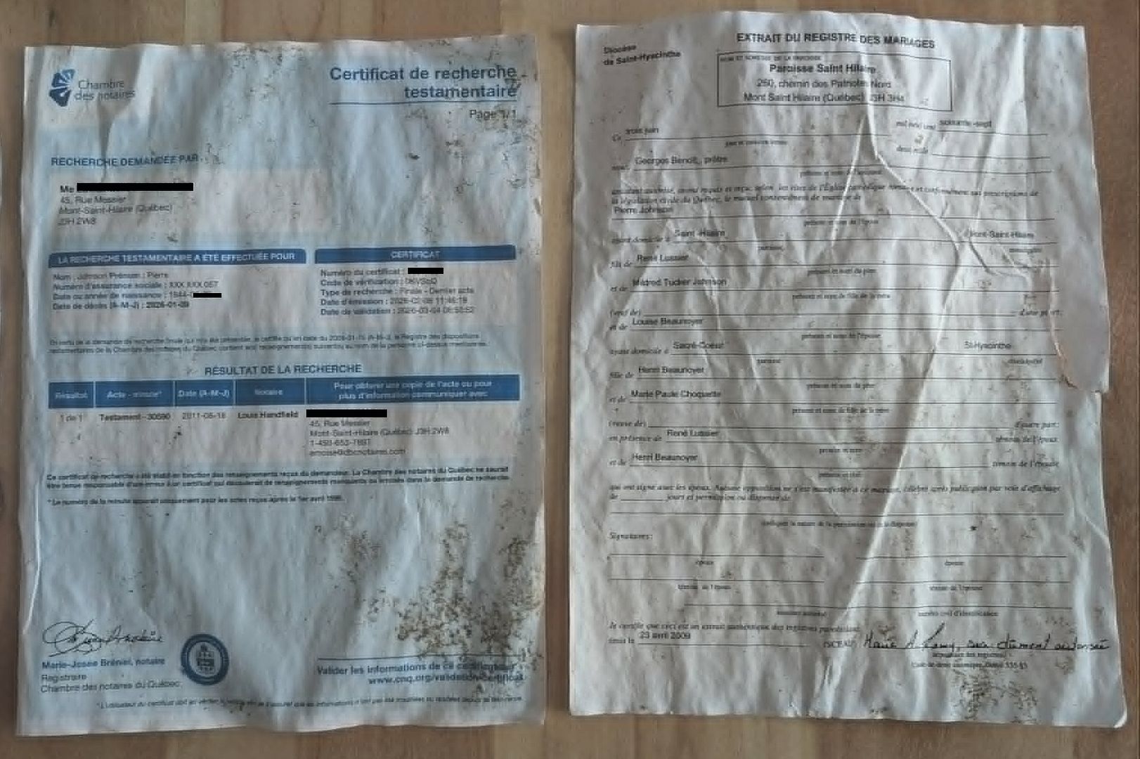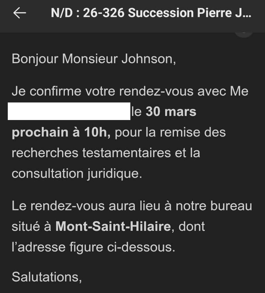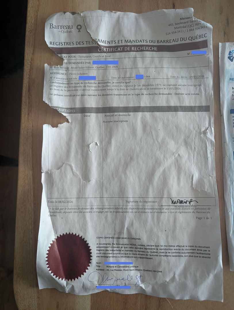 Alors voilà ! Lundi le 30 mars, la notaire m’a remis les certificats de recherches testamentaires effectuées auprès du Barreau du Québec, ainsi qu’à l’Ordre des Notaires. Et elle m’a même fourni une copie toute neuve du testament de mon père, puisque l’exemplaire produit en 2001 par le fondateur du bureau Handfield avait été tellement mal photocopié qu’il était invalide. Tout est donc terminé de ce côté là. Je n’ai plus besoin de leurs services. D’où ce courriel qui m’a été expédié le lendemain de notre rencontre finale.