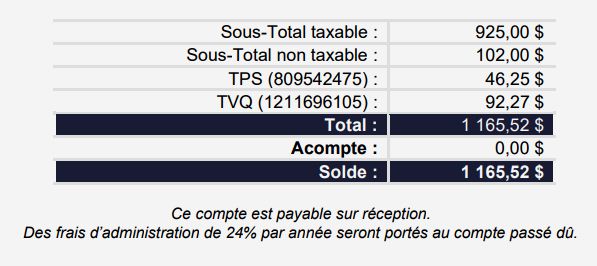 Alors voilà la facture finale, qui inclut le montant avant taxes, les taxes, le montant après taxes, et les avertissements et menaces légales auquelles ils faut s’attendre de la part de ce genre d’entreprise.