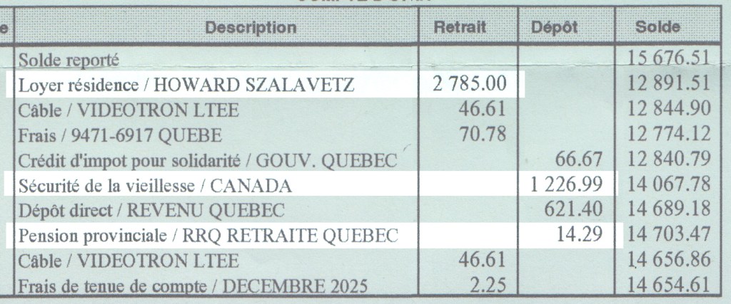 Son loyer est de $ 2 785. Elle reçoit $1 240 de pension. Ce qui signifie que chaque mois, elle est déficitaire de $1 545. Bon, ici, elle a eu d’autres dépots totalisant $688, ce qui diminue la perte de décembre 2025. Mais il s’agit de dépots trimestriels.