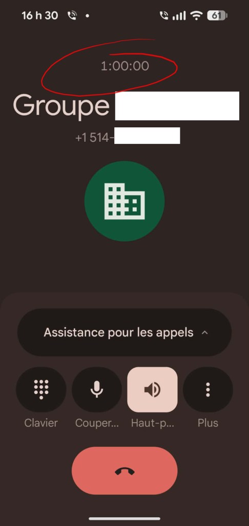 Le compteur montre que ça fait 24 minutes que je suis en attente. Sûrement qu’elle va me revenir d’ici à quelques secondes. J’opte donc pour ne pas répondre au notaire, en espérant qu’il me laisse un message sur ma boite vocale. Ce qu’il fait, Dieu merci.