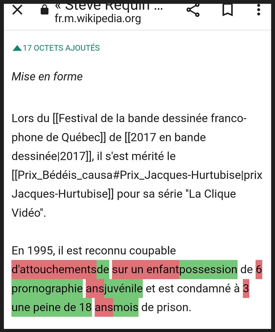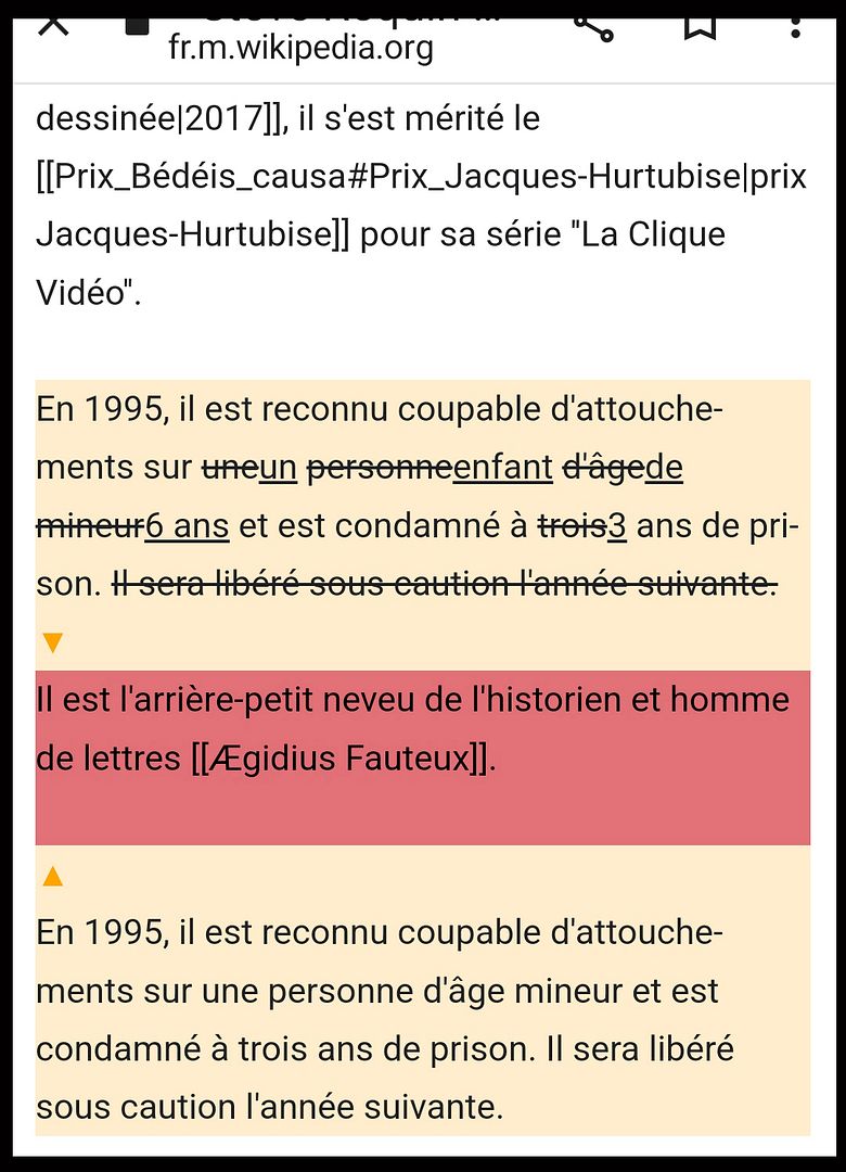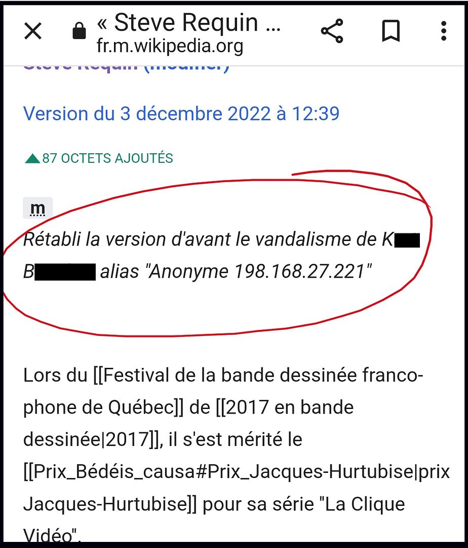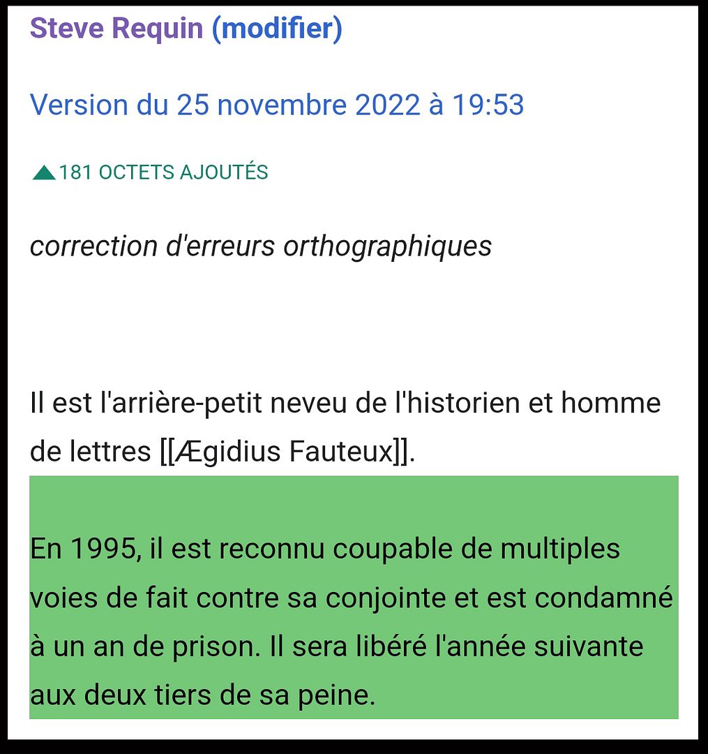 MOI: Le simple fait qu’il a rédigé 2-3 accusations différentes sur Wiki avant de s’arrêter sur celle-là démontre quelque chose que mes proches ont déjà constaté depuis des années : il ne sais pas de quoi m’accuser. Il ne trouve rien de pertinent à me reprocher, alors il est obligé d’inventer: violence, obsession sexuelle, misogynie… Tu sais que Flavie a toujours été une militante féministe engagée. Je n’aurais certainement pas pu être en couple avec elle de 2013 à 2018 si j’étais tel que K███ B███████ me dépeint.