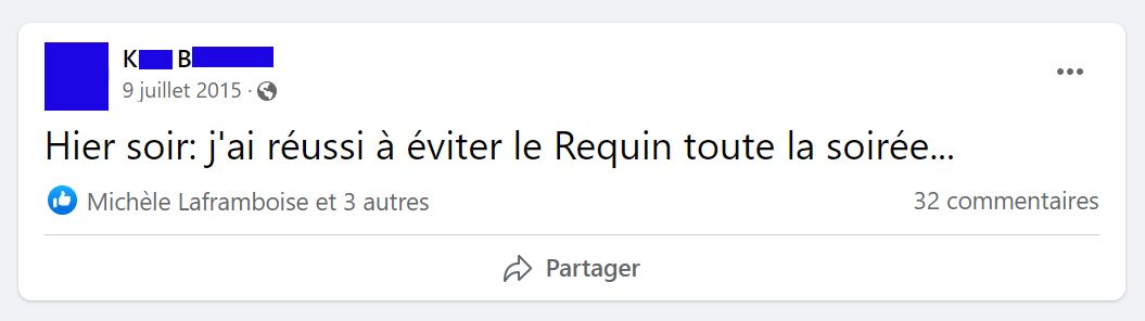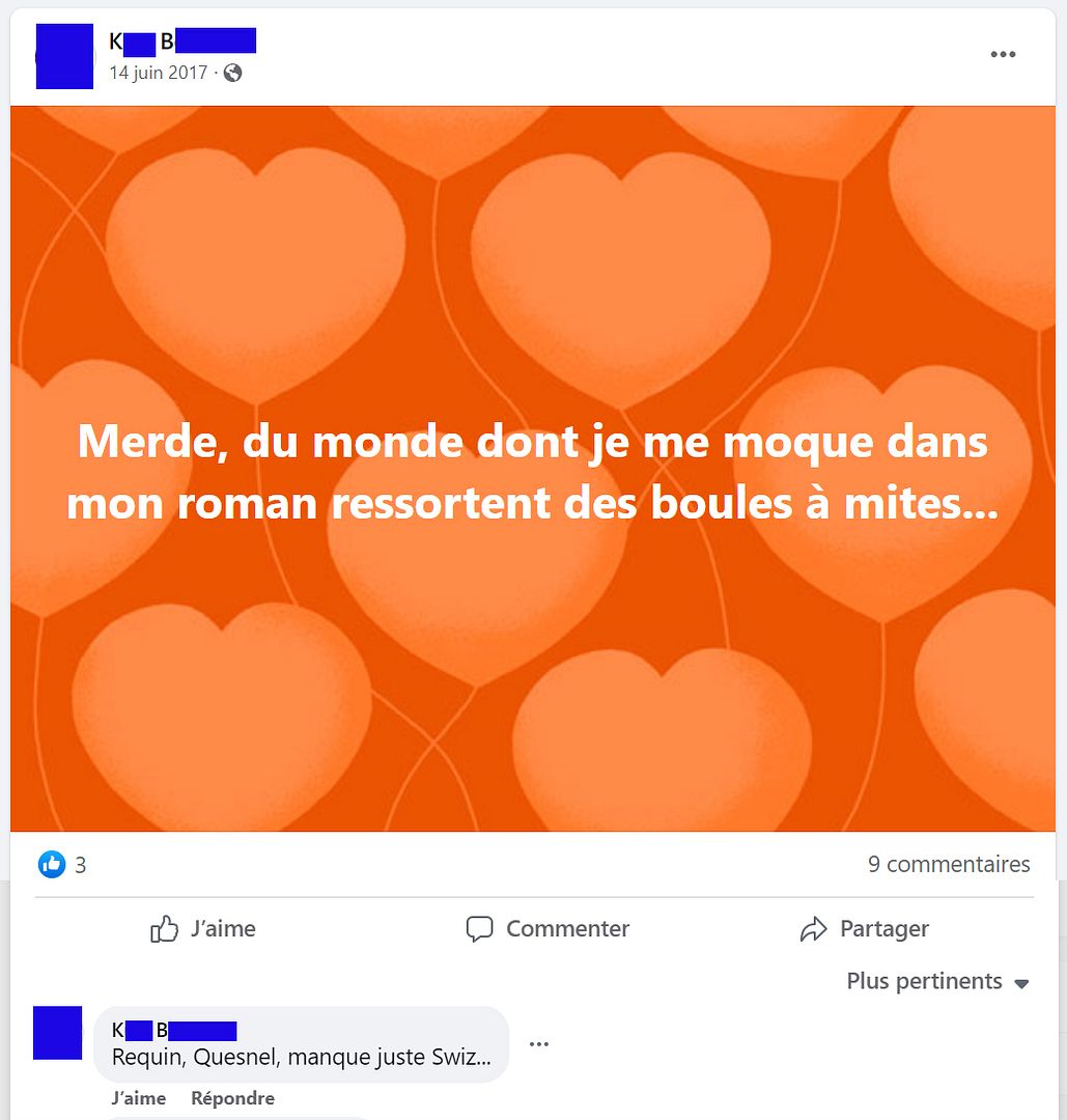 (Sur ce, il m’envoie une capture d’écran de la page Facebook de K███ B███████, que je ne vous montrerai pas ici pour des raisons évidentes.)