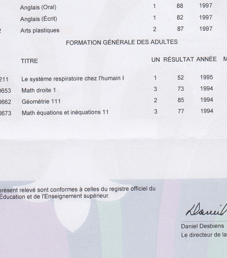 MOI: De plus, en 1993-94-95, j’étais de retour aux études au Centre Saint-Paul pour finir mon secondaire. Ensuite, en 1995-96-97, je poursuivais mes études au Cégep André-Laurendeau. Et j’ai les relevés de notes du Ministère de l’Éducation avec les dates pour le prouver.