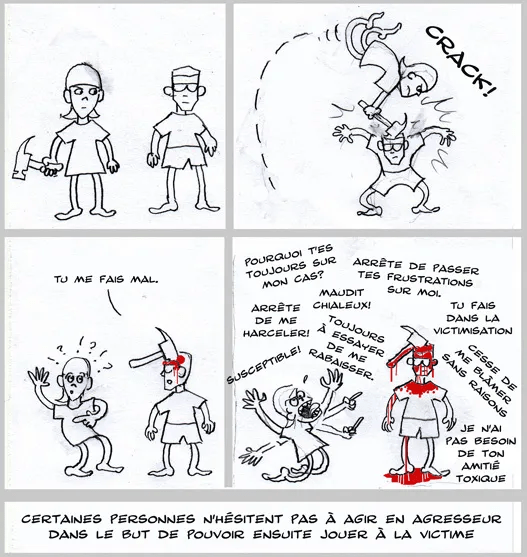 Face à ton refus de subir ses abus, son réflexe d’inverser les rôles fera qu’il se donne l’image de la victime tout en t’accusant toi d’être la personne toxique du duo puisque, prétend-t-il, tu essaies de le faire passer pour le méchant. Cette petite BD que j’ai fait il y a quelques années illustre bien ce phénomène.