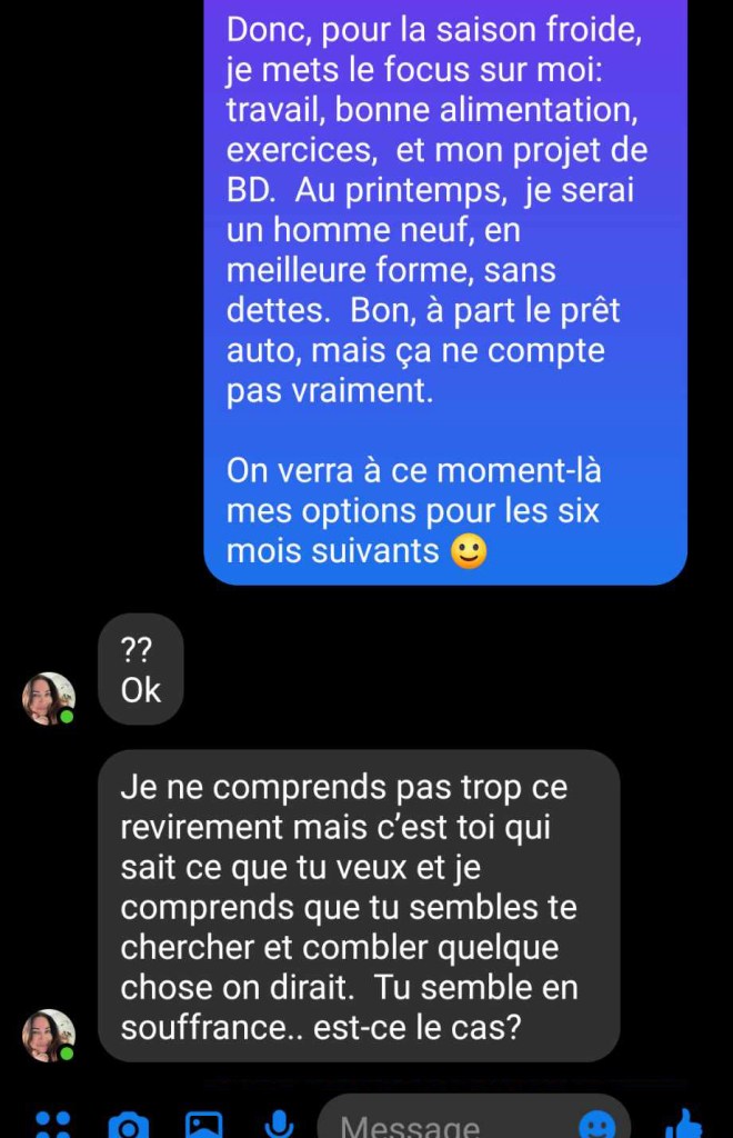 Je veux bien le croire. En tant que solutionnaire, j’ai toujours été homme à faire face à mes travers, car les reconnaitre est la première étape qui permet de les corriger. N’empêche que j’avais beaucoup de difficulté à comprendre où se situait mon problème de comportement, au juste. En quoi est-ce que le fait de vouloir évoluer et d’améliorer ma situation et la majorité des aspects de ce que je suis, puisse être aussi tabou aux yeux de toutes ces femmes? Et pas seulement celles avec qui j’ai été en couple. Prenez par exemple ce bout de conversation que j’ai eu il y a dix mois, au début de l’automne dernier, avec cette femme de 46 ans contactée sur Facebook Rencontre