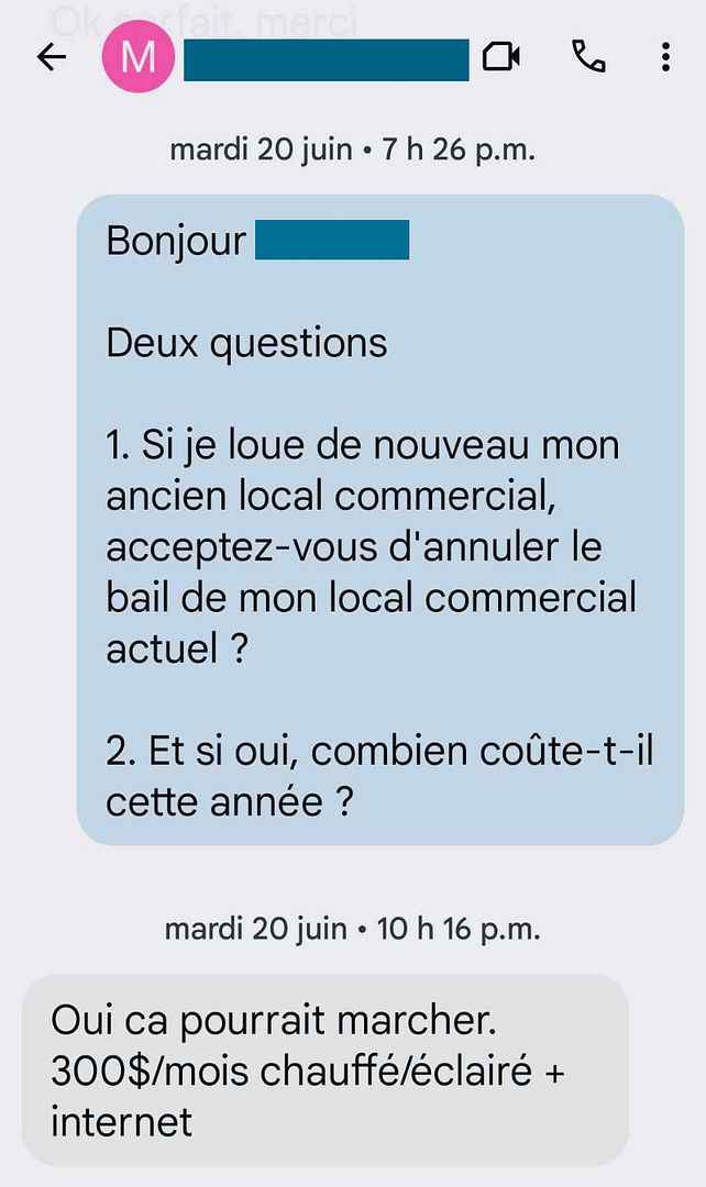 Je lui écris. Je prends la peine de lui préciser qu’il s’agira d’un transfert de bail commercial, et non d’une location supplémentaire. Je ne tiens pas à payer deux locaux en plus de l’appartement.