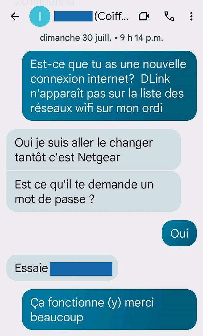 Cinq semaines plus tard, je constate que je n’ai plus de Wi-Fi. Ce n’est pas la première fois que la connexion cafouille. Dans ce temps-là, il me suffit d’aller au salon de coiffure, puis débrancher et rebrancher le modem. Mais cette fois, en consultant la liste des réseaux disponibles, je constate que le nôtre n’y est plus. J’écris à la coiffeuse.