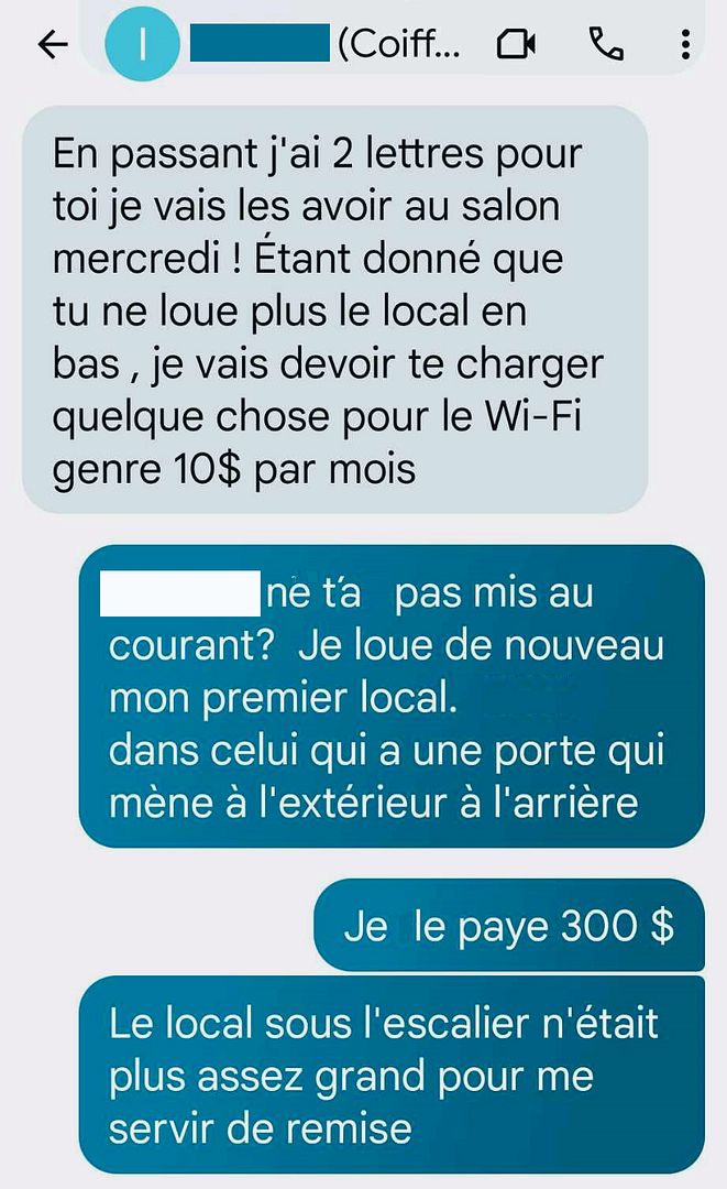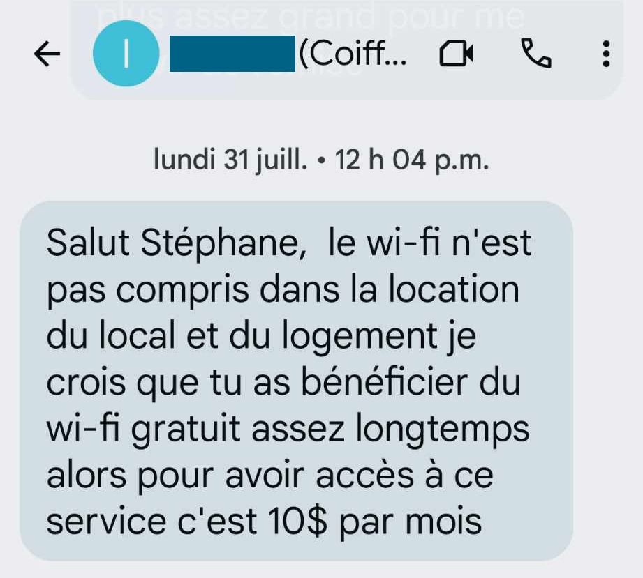 Comment ça, « le Wi-Fi n’est pas compris dans la location » ? Je loue en bas depuis deux ans et trois quart, et j’ai toujours eu internet en prime. D’ailleurs, le proprio m’a dit que ce serait inclus lorsque je louerais de nouveau mon ancien local. Et comme on l’a vu plus haut, j’ai le texto pour le prouver à la coiffeuse.