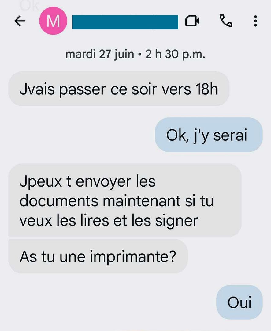 J’imprime donc ces documents, sans les modifier. En deux exemplaires, un pour lui, un pour moi. Il passe chez moi et on les signe.