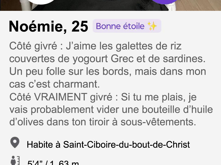 Comme je l’ai expliqué il y a quelques billets de ça, Facebook Rencontre permet de choisir l’âge des gens de qui on veut voir le profil. Alors si l’application m’a montré le profil de Noémie, c’est parce que mon âge faisait partie de ses préférences. Par conséquent, lorsque j’ai prétendu que je savais que j’étais trop vieux pour elle, en réalité je n’en savais rien du tout.