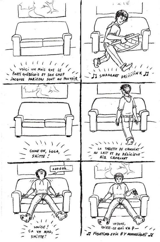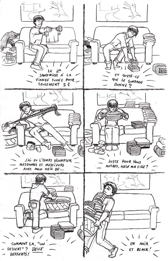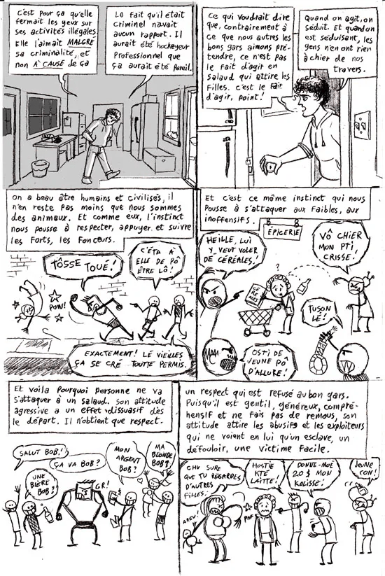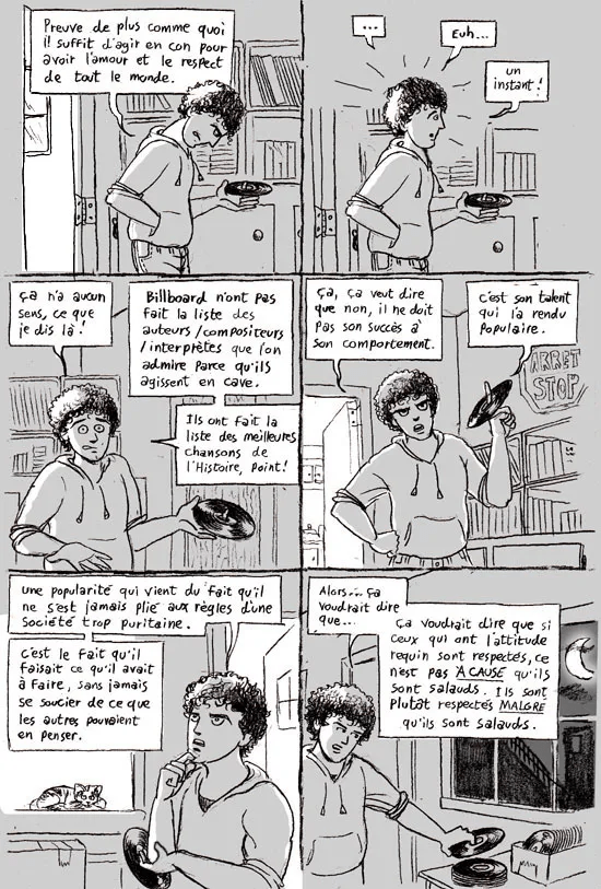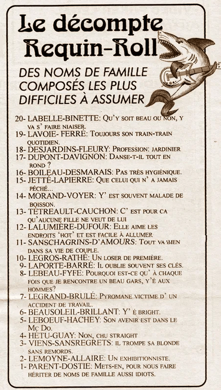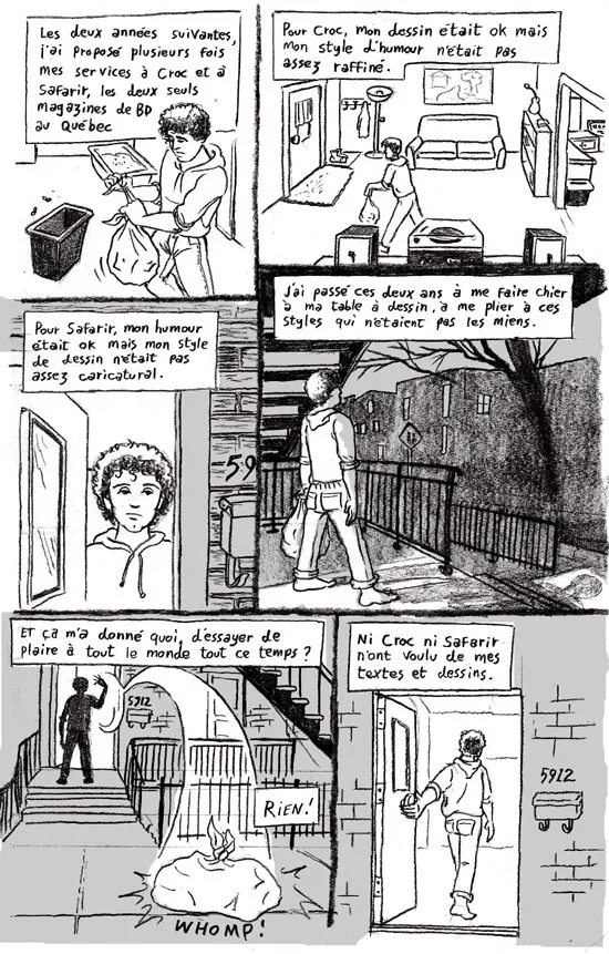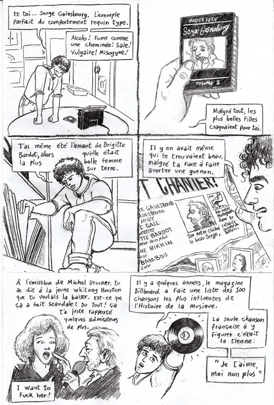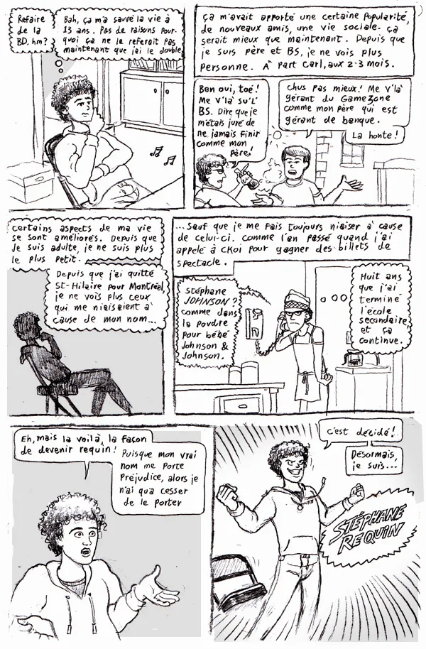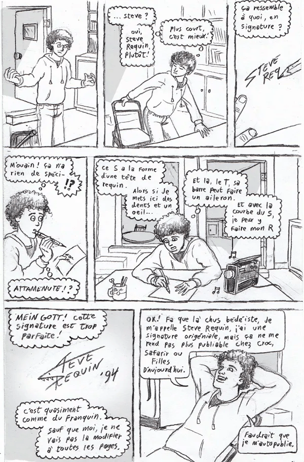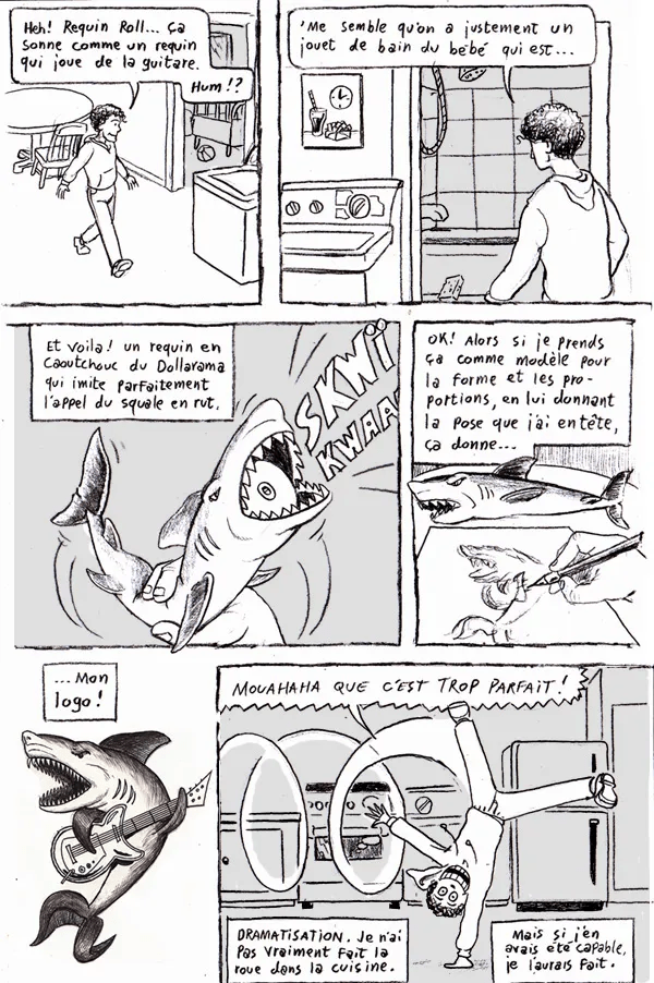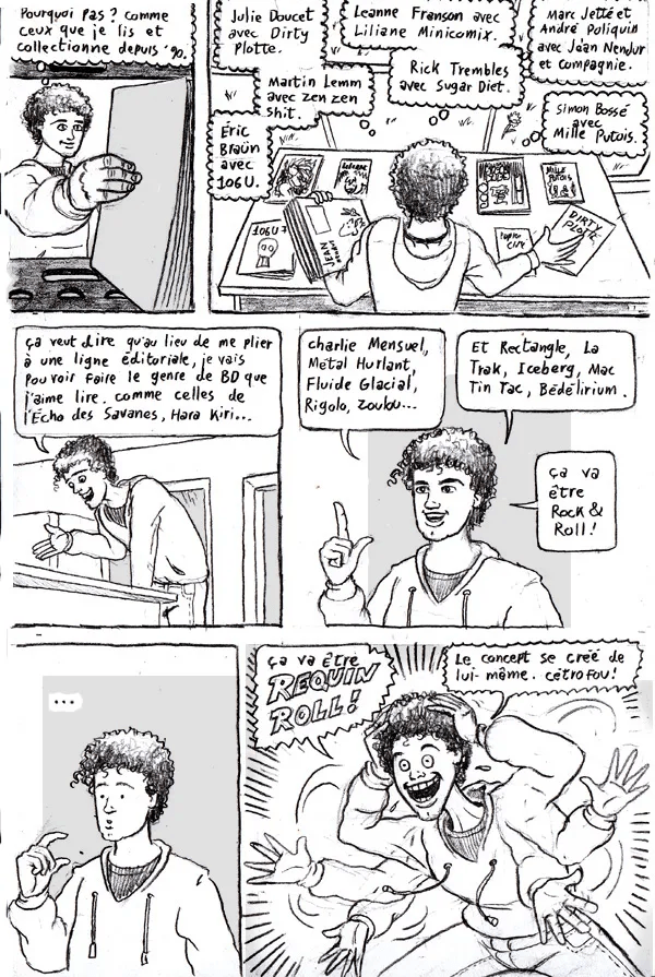 Aujourd’hui, lorsque je relis ma production requinesque, de mon premier fanzine Requin Roll de 1994 jusqu’à ma dernière BD dans Safarir en 2008… Ouf! Je constate que c’est du gros n’importe quoi, pourvu que ça choque et attire l’attention par la controverse. Le tout enrobé d’un humour forcé qui n’était qu’un réflexe de survie morale. La seule chose tirée de cette époque dont je suis vraiment fier, c’est d’avoir créé le premier texte viral québécois francophone d’internet.