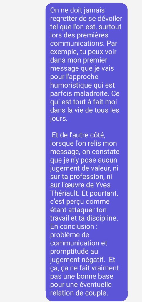 Je n’essaye pas de l’éblouir en parlant comme un dictionnaire, mais le simple fait que j’utilise le terme question réthorique lui démontre que j’ai une certaine éducation. Je ne prétend pas être à son niveau littéraire, mais si j’ai eu à lire ce roman au cégep, ça signifie que j’ai moi-même étudié en Lettres, ce qui sera perçu par son inconscient comme un bon point en commun entre nous. Sinon, mes paroles sont celles d’un homme poli, raisonnable, qui reconnait ses torts. À côté de ça, elle fait piètre figure, avec sa réponse brusque dans laquelle elle démontre n’avoir rien compris de mon approche.