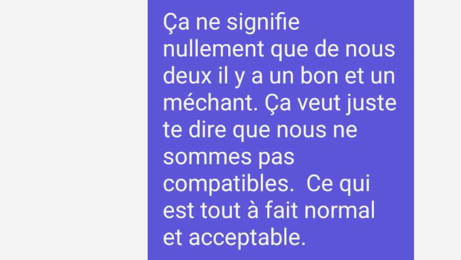 Le sentiment qui passe en douce dans ce message est « Tu ne mérites pas d’être en couple car tu es du genre à avoir des soupçons négatifs contre autrui sans raisons valables. » Et ça, c’est quelque chose qu’elle voudra certainement me prouver comme étant faux. Il n’en tient qu’à moi de lui en donner l’opportunité.