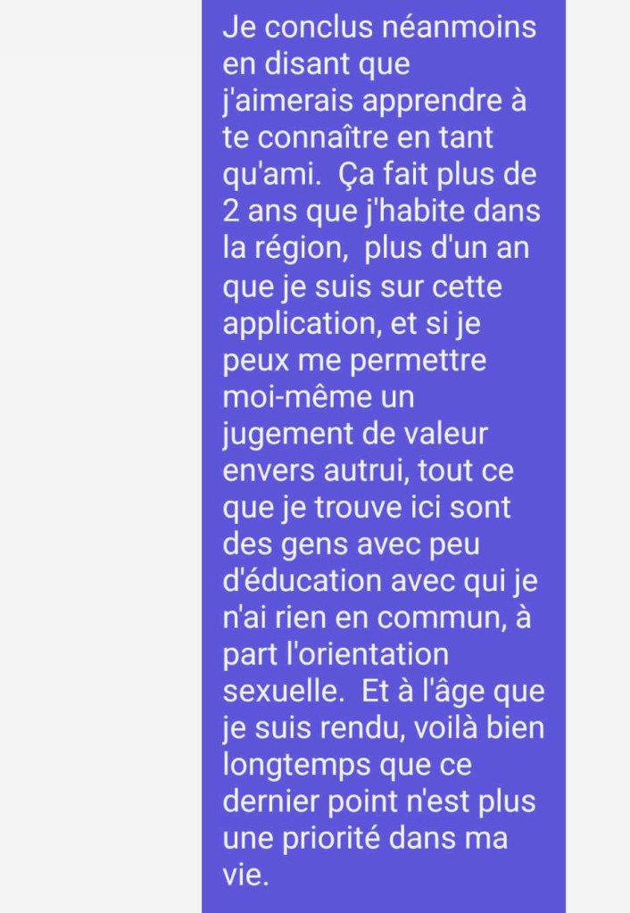 Les hommes ont tous cette réputation d’obsédés sexuels, surtout les célibataires d’apps de rencontres. Alors lorsqu’un homme fait comprendre à une femme que même sexuellement il n’en veut pas, elle a de quoi se taper une sérieuse remise en question. En lui laissant la porte ouverte avec mon offre d’amitié, je lui donne l’opportunité de se racheter. De plus, en tant que femme éduquée, il est évident qu’elle a eu droit à plus que sa part d’ignorants qui l’ont approchée. En lui disant que c’est moi-même ce que j’ai vécu ici, je lui démontre que nous avons ça en commun.