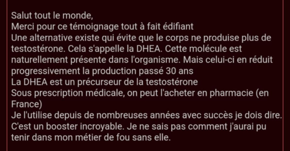 Je suppose que ses intentions sont bonnes. Mais comme c’est le cas pour chaque avis donné par une personne qui n’y connait rien, l’avis en question vaut justement ça : rien ! Parce que s’il avait consulté un professionnel de la santé à ce sujet, celui-ci lui aurait expliqué que lorsque le taux de testosterone est bas, seul un traitement de remplacement peut le remonter.