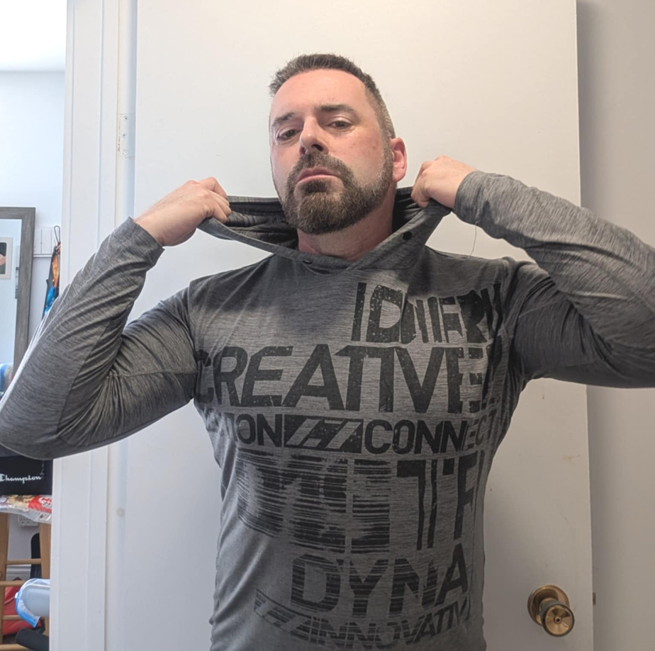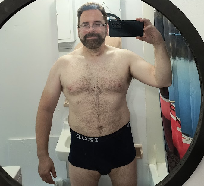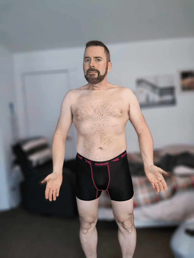 Photo 2. Mars 2025. Après presque six mois de traitement de remplacement. Et après presque six mois de gym, avec pour seuls suppléments alimentaires que protéines, créatine et caséine.