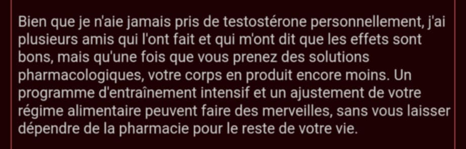 « Bien que je n’aie jamais pris de testosterone personnellement, j’ai des amis qui l’ont fait et qui m’ont dit que les effets sont bons. Mais qu’une fois que vous prenez des solutions pharmacologiques, votre corps en produit encore moins. Un programme d’entrainement intensif et un ajustement de votre régime alimentaire peuvent faire des merveilles, sans vous laisser dépendre de la pharmacie pour le reste de votre vie. »