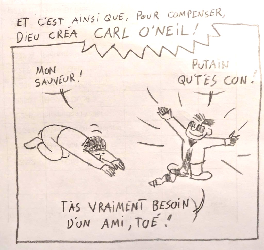 J’ai parfois parlé ici de celui que je considérais comme étant mon meilleur ami de l’école secondaire. Je ne saurais compter le nombre de fois où j’ai entendu de sa bouche un joyeux « Hostie qu’t’es con ! » qui m’était adressé. Ça inclut une case dans la petite BD qu’il m’avait gribouillé dans mon album des finissants. Une où il me dessine me prosternant devant lui.