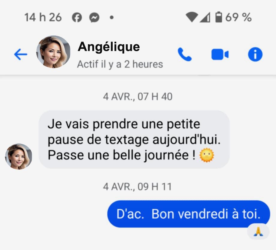 Comme premier exemple, (Appelons-là Angélique), notre « Jour 1 » a en fait duré deux jours et demi, à se texter quasiment non-stop. Et puis, le 3e jour, vers 15h00, brusque changement de comportement. Elle m’annonce qu’elle va cesser de me texter afin de ne pas me déranger pendant que je suis au travail.