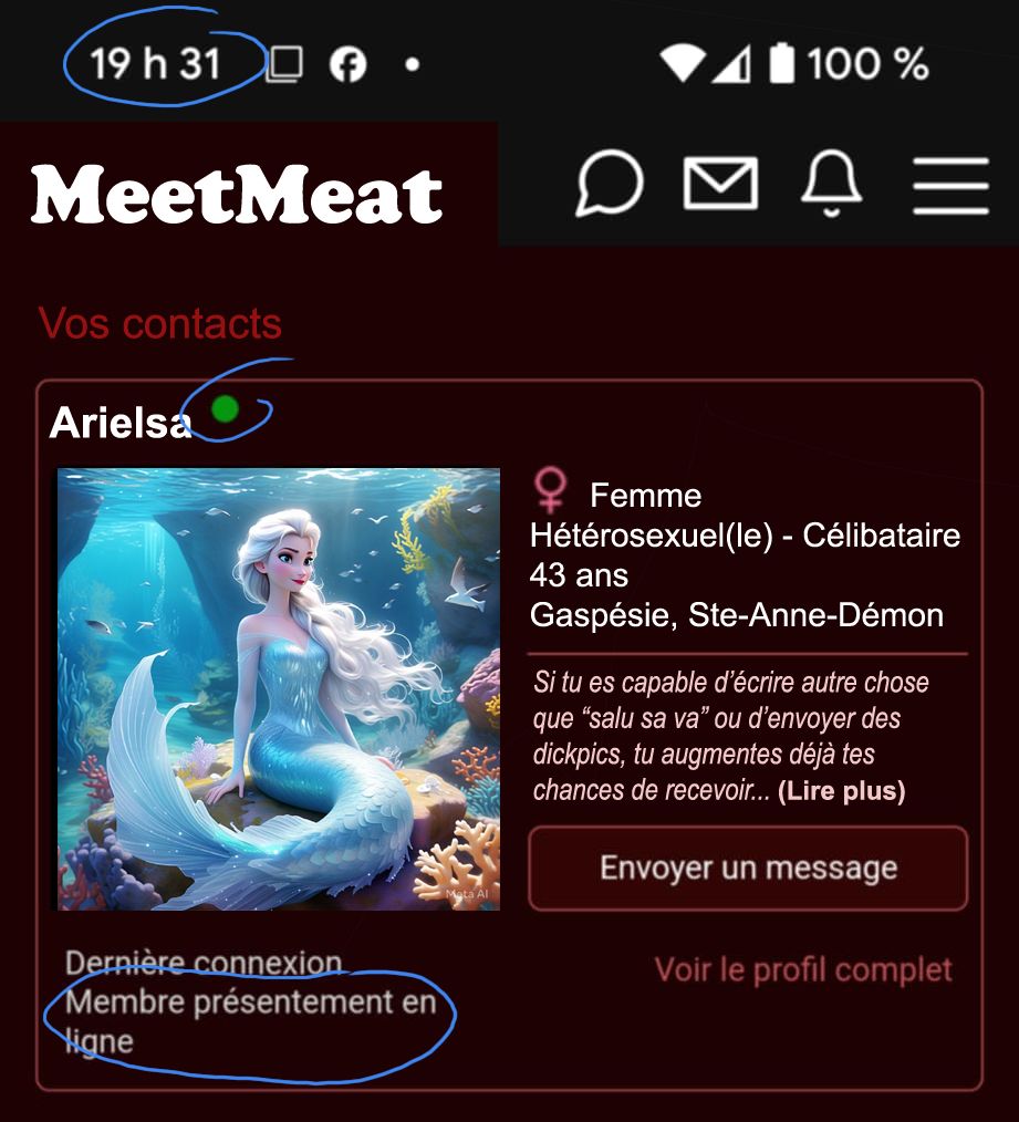 Je passais justement la soirée sur MeetMeat à jaser avec une ex avec qui je suis en bons termes. Et toute la soirée, avant, pendant et après qu’Arielsa m’ait envoyé son texto de trop-occupée-pour-être-sur-le-net, je voyais la petite boule verte signifiant « ce membre est en ligne en ce moment sur MeetMeat » à côté de son nom dans ma messagerie.