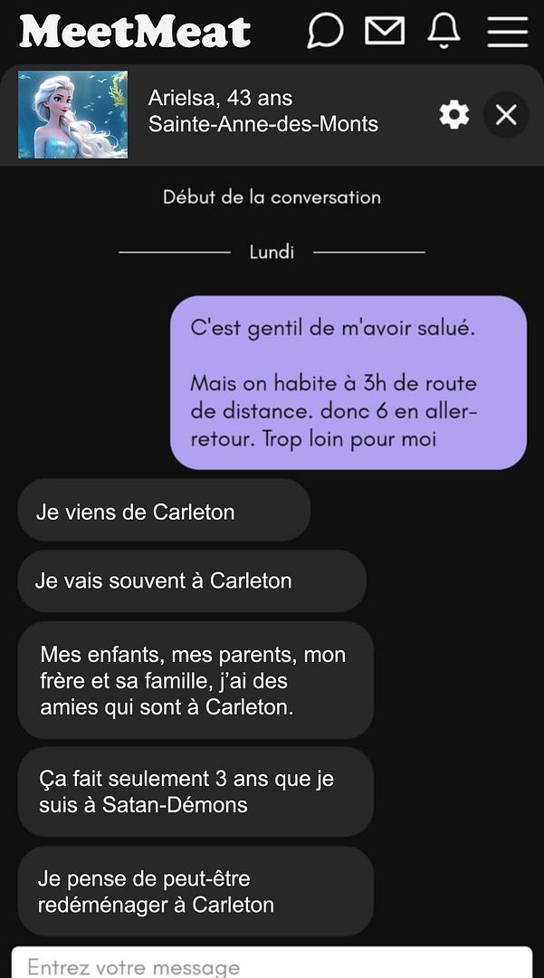 Ce soir-là, on passera des heures sur la messagerie de MeetMeat. Jusqu’au moment où, alors que l’on s’apprête à se quitter pour dormir, elle se sent assez en confiance avec moi pour que l’on échange nos adresses Messenger.
