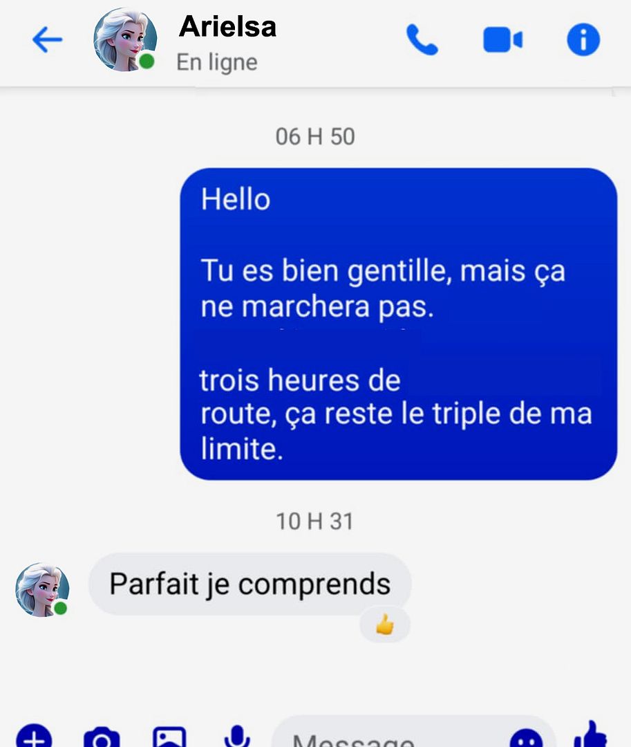 Depuis un mois, j’ai eu trois contacts intéréssants. Elles ont toutes suggéré que l’on poursuive la discussion hors-site, sur Messenger. Mais à quelques variantes près, voici comment ça s’est passé à chaque fois :