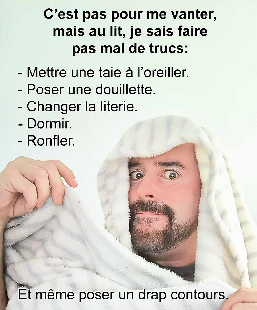 Tous sites et apps confondus, cette image m’a rapporté une douzaine de « Mais saurais-tu le plier, ce drap contours? » en guise de phrase d’approche de ces dames. Bon, les deux tiers n’étaient pas intéressées à me rencontrer. Elles voulaint juste me dire que mon profil les a bien fait rigoler. N’empêche que mon approche me rapporte l’effet escompté : me faire remarquer. Et une fois le contact établi, il ne reste plus qu’à poursuivre le dialogue. Parfois ça reste court. Parfois ça reste juste amical. Et parfois, il y a un intérêt mutuel. D’ailleurs…