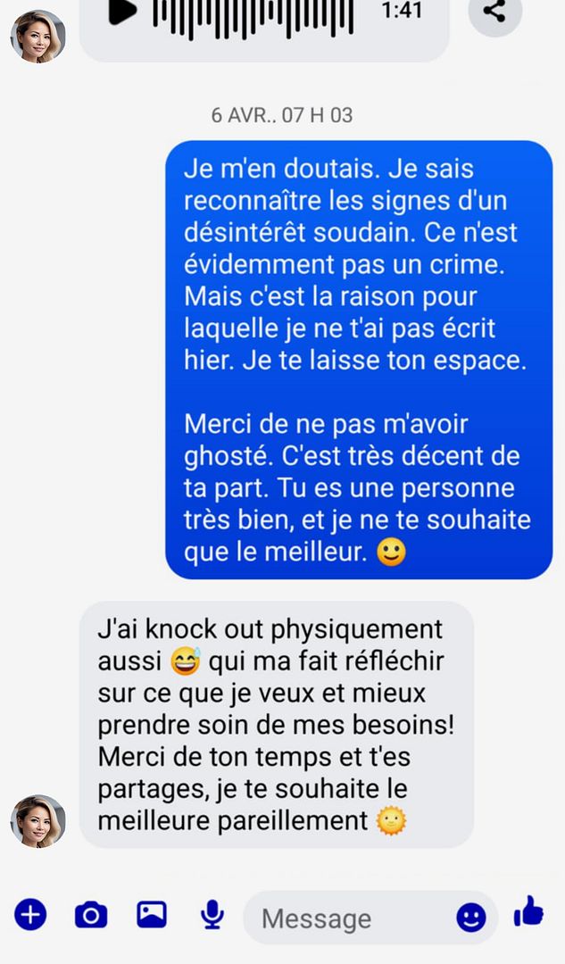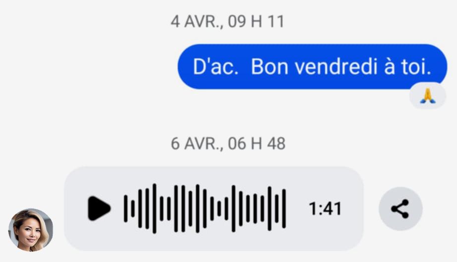 48 heures plus tard, comme je m’y attendais, en plus de sa pause de texto du vendredi le 4 avril, elle a également gardé le silence radio samedi le 5. Ce n’est que le matin du lundi le 6 qu’elle reprendra contact en m’envoyant un message vocal.