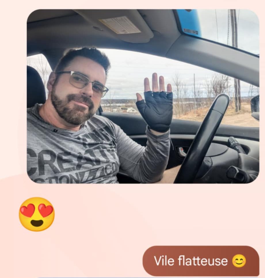 Elle est vraiment charmante, de prendre sans cesse des nouvelles comme ça. On sent vraiment sa hâte de me rencontrer. On échange quelques messages. Elle m’envoie un selfie pris à l’extérieur. Je lui en envoie un à mon volant. En guise de réponse, elle envoie un émoticon animé qui a des cœurs à la place des yeux, et dont la bouche bouge de manière à dire « Wow ! »