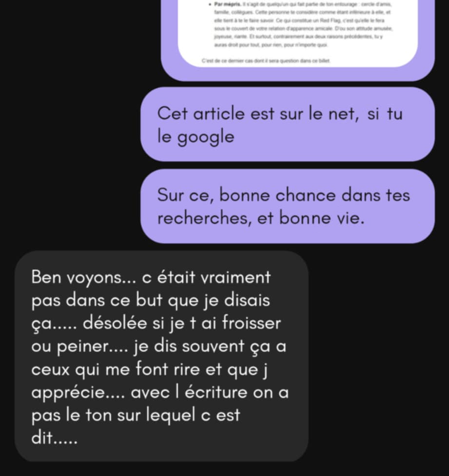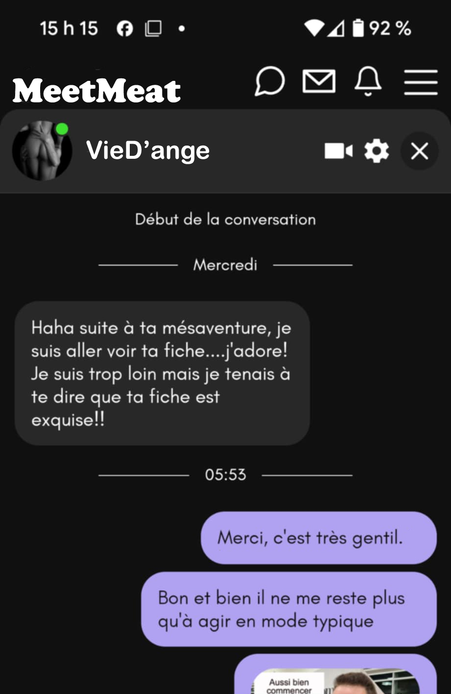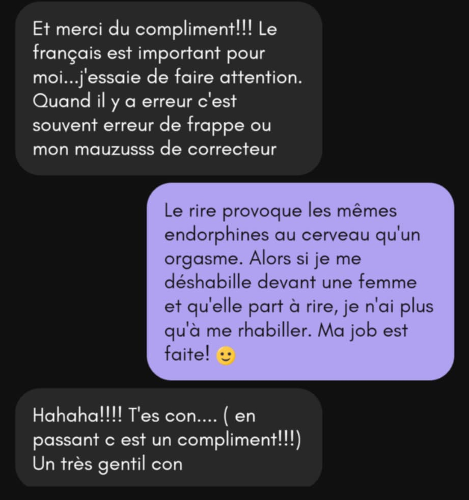 Ce soir-là, on passera des heures sur la messagerie de MeetMeat. Jusqu’au moment où, alors que l’on s’apprête à se quitter pour dormir, elle se sent assez en confiance avec moi pour que l’on échange nos adresses Messenger. On y jase encore quelques jours, mais je finis quand même par y renoncer.
