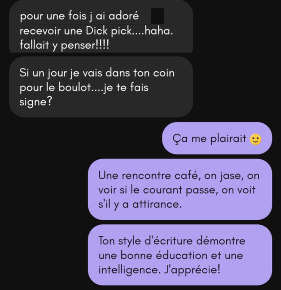 L’autre femme de Sept-Îles se nomme Brigitte. Je commence par lui dire la même chose qu’à Fanny, comme quoi Sept-Îles étant situé à 2h30 de chez moi, c’est un peu trop loin. Elle me répond qu’elle le pense aussi. Mais elle a aimé mon profil, donc elle a pris une chance. Sur ce, elle m’envoie des photos. Et il se trouve qu’elle aussi est une belle, mince et petite femme, celle-ci ayant les cheveux bruns légèrement frisés. Avec elle, je jase un peu, mais je finis par laisser laisse la conversation en suspens.
