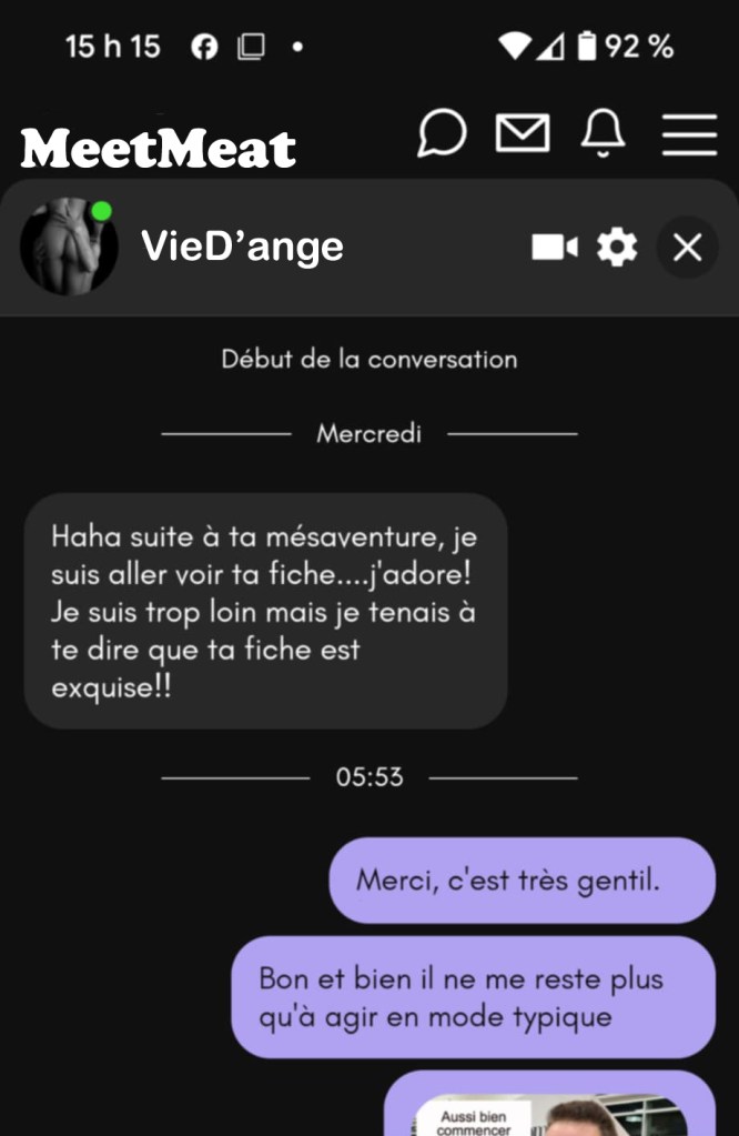 Sur MeetMeat, on ne peut pas partager de lien. Alors je lui ai fait une capture d’écran du début de mon article, avant de la lui ai envoyer.