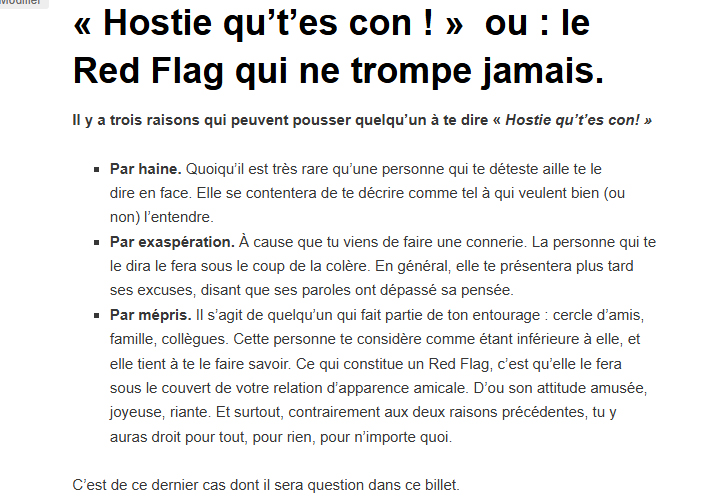Cette dernière réplique me fait l’effet d’une gifle. Et pour cause : Il y a deux mois, j’ai justement posté ici un billet qui s’intitule « Hostie qu’t’es con ! » ou: Le Red Flag qui ne trompe jamais. J’y démontre qu’à chaque fois que j’ai eu une personne dans mon entourage qui m’a traité de con de façon joyeuse et en riant, dans 100% des cas, cette personne était condescendante, rabaissante, et avait comme opinion de moi que je lui étais inférieur. Chose qu’elle démontrait en ne m’accordant aucune crédibilité et encore moins de respect.