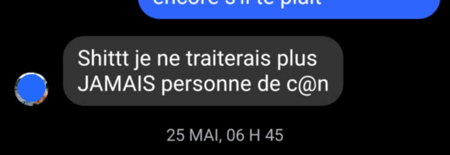 « Je vais me permette d’être franche. Tu as mis ta limite, oui. Je t’ai expliqué mon point de vue par rapport à ce mot qui pour moi n’est pas un manque de respect, mais plutôt une mauvaise habitude « dans le parler ». Dans mon entourage, je traite tout le monde de con et ça n’a aucune connotation négative, ni manque de respect, JAMAIS.