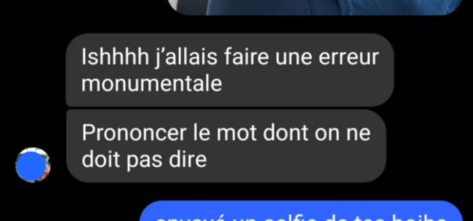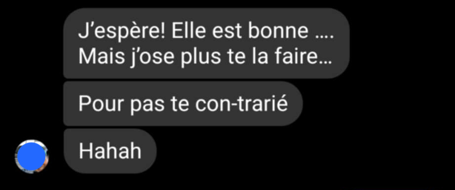 Or, en réponse à une de mes blagues, Daisy m’a envoyé un message vocal dans lequel elle disait « Ha! Ha! Ha! Hostie qu’t’es con ! » … Soit exactement le Red Flag en question. Mot pour mot.