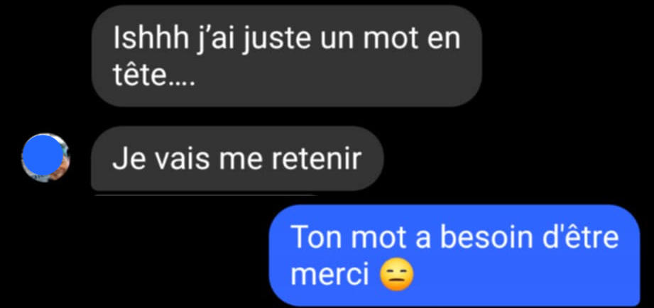 Je suis désolé de ne pas avoir respecté ta limite. Par contre pour ma défense, tu as joué à ça ! Toujours à trouver la blague pour me faire répliquer ce mot.«