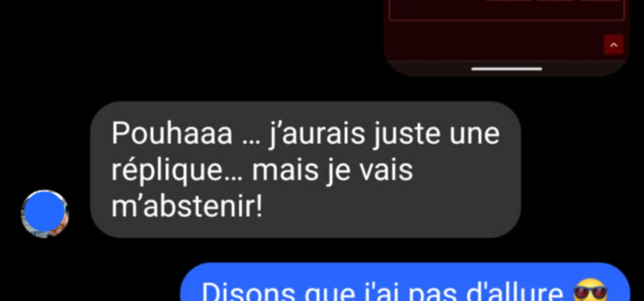 Je l’ai donc envoyé lire mon billet de blog, afin qu’elle apprenne les expériences que j’ai vécues avec ceux qui me qualifiaient de con en riant, pour qu’elle comprenne mon point de vue sur le sujet. Apparemment elle a compris, car après lecture elle m’a écrit ceci :