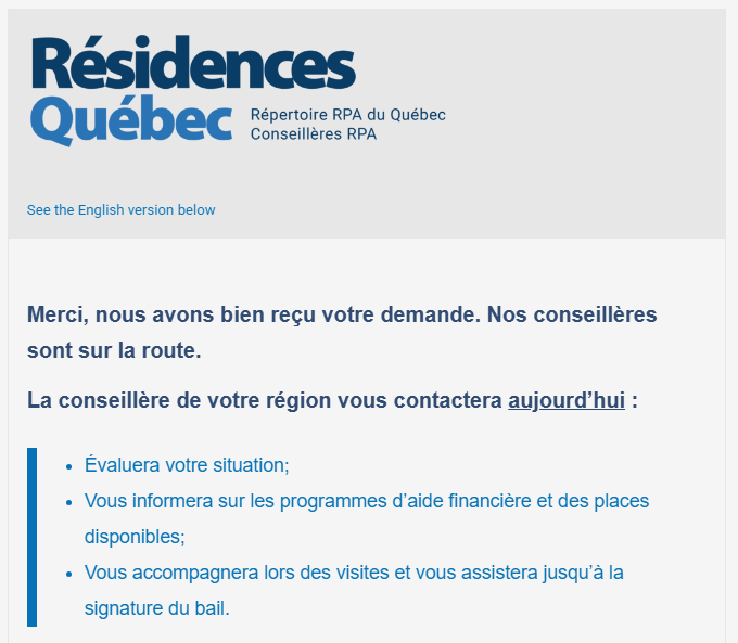 La travailleuse sociale de mon père ne sera disponible que demain. En attendant, je ne reste pas les bras croisés. Je parcours Google, à la recherche de quelque chose qui puisse m’aider à retracer ma mère. À tout hasard, je me dis qu’il existe peut-être une centrale des résidences pour personnes âgées au Québec. Je tombe sur exactement ça : Résidences Québec. Je leur écrit.