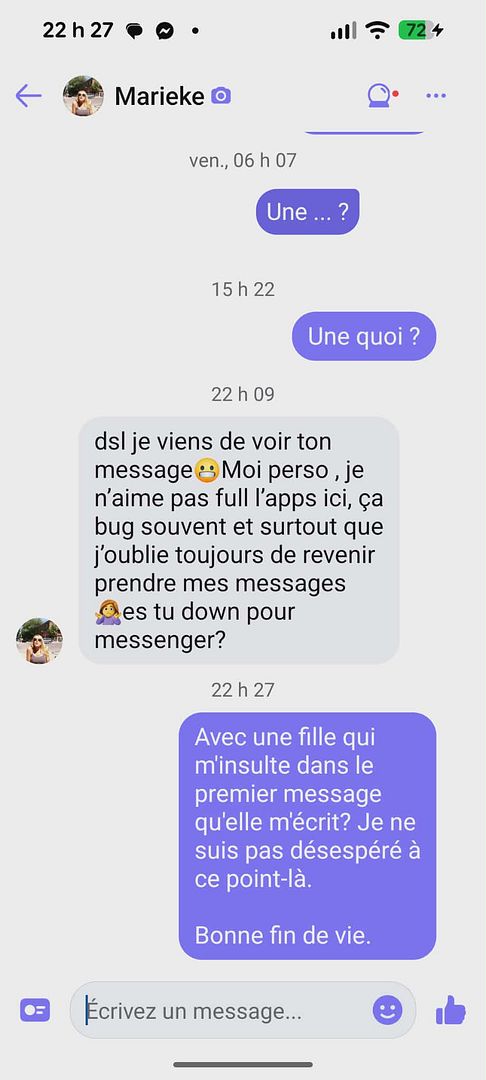 Presque sept heures plus tard, elle finit par m’écrire. Mais pas pour répondre à ma question. Elle me propose de passer directement à Messenger. Or, rendu là, mon idée à son sujet était faite. Et je ne me suis pas gêné pour la lui dire.