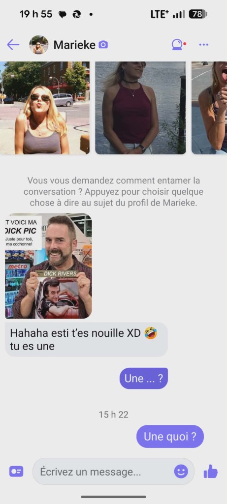 Et justement, il y a quelques jours, sur Facebook Rencontre, je me suis fait contacter par une femme qui correspond à mes nouveaux critères. 43 ans. En forme. Belle. Et si j’en crois ses photos, active. En trouvant mon profil, elle a mis un commentaire sous l’une de mes images. Celle où je tiens une photo de Dick Rivers, en disant que c’est ma Dick pic.