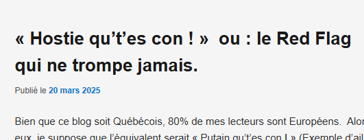 Elle me sert l’équivalent de« Ha ha ha, hostie qu’t’es con ! » Et ceci est un red flag qui ne trompe jamais. Tel que je l’ai écrit ici l’an dernier, l’expérience m’a appris à la dure que toute personne qui me sert cette phrase démontre n’avoir aucun respect pour moi. Et à chaque coup, effectivement, j’ai vécu avec ces gens des relations abusives.