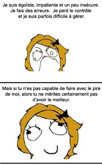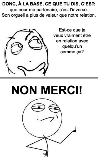 Rendu à ce point, elle était trop habituée à me traiter de con pour pouvoir accepter d’arrêter de le faire. Elle a choisi de mettre fin à la relation. Chose que j’aurais fait moi-même de toute façon. Mais le fait que ça vienne d’elle démontre clairement qu’à partir du moment où tu laisse une femme te manquer de respect, il n’y a plus moyen de revenir en arrière.